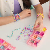 5 great jewelry activities in 1 full storage solution! The 5 in 1 Activity Tower rotates for easy access, has 5 removable storage trays and a bracelet holder to display creations. Each storage tray houses a unique activity; Heishi Craze, Just Bead It, It’s Elastic!, Friends Forever and Link Em’ Up! The trays can be removed to take on-the-go or used beside the tower for easy access. Take 1 or all 5 activities with you! Make over 40 pieces of jewelry with the included 1600 components.