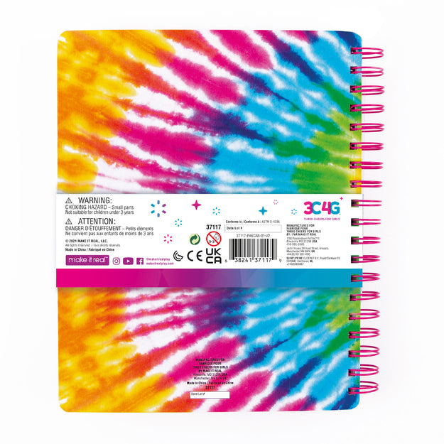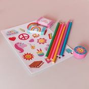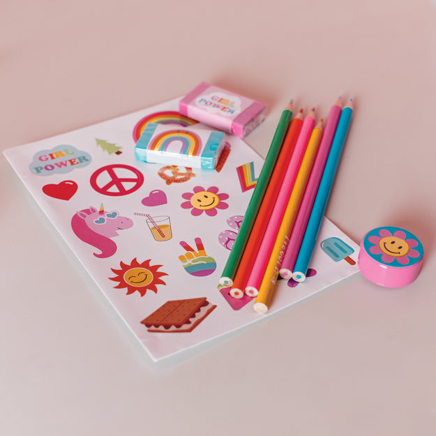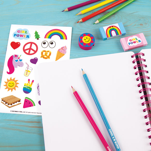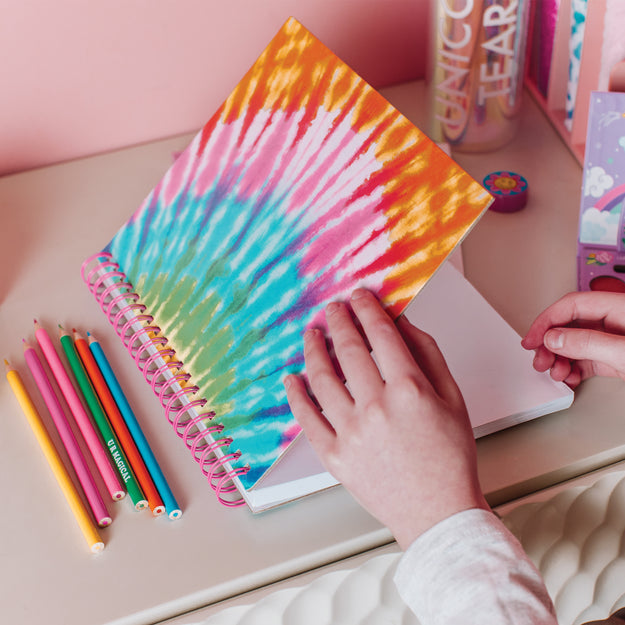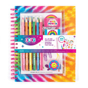 This all-in-one set includes a tie dye-themed spiral-bound sketchbook, 6 colored pencils, 2 erasers, pencil sharpener, and sticker sheet
