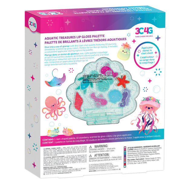 Dive into a sea of glamor with this clam shell palette featuring 10 stunning strawberry-scented lip gloss colors in sea creature-shaped wells! Open each sparkly, transparent layer of the palette and discover a delightful assortment of lip gloss colors, perfect for adding a touch of glam for any outfit of the day. Ideal for on-the-go styling, it includes a convenient applicator storing right in the palette. This palette makes a great gift idea for tweens looking for an introduction to makeup styling, encouraging self-expression and creativity! Bring a world of aquatic glamor to life with this trendy palette. All cosmetics are safety tested for kids ages 8+.