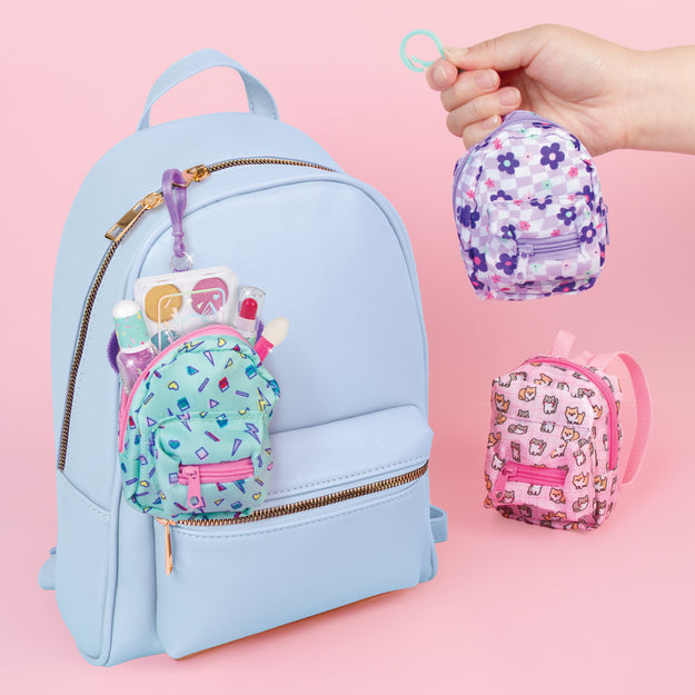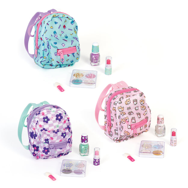 Mini cosmetics so cute you’ll want them all as a prize! Each set includes with 4 shades of eyeshadow, an applicator brush, a mini lip gloss tube, and bottle of nail polish, all storing an uber cute mini backpack. Attach to a full-sized bag with the bag clip and take this playful and uber trendy set on the go! Collect them all to sport three different mini backpack patterns and style palettes. This mini cosmetic set makes a great gift idea, whether it’s for a birthday bash, holiday, or just because! All cosmetics are safety tested for kids ages 8+.