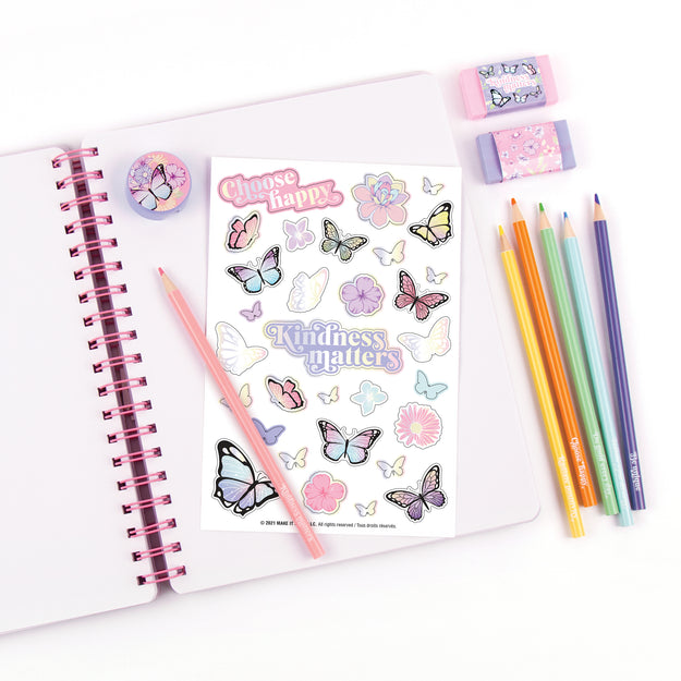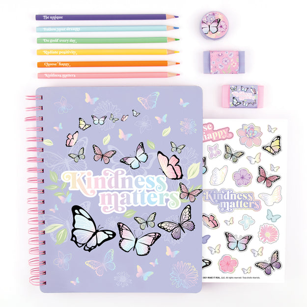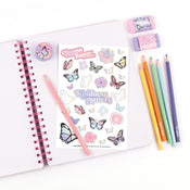Journaling is the ultimate form of self-expression and a wonderful developmental opportunity for your child's creativity. Unlock their full potential with this stylish all-in-one journal set that includes a butterfly sketchbook with 200 pages, 6 colored pencils, 2 erasers, 1 pencil sharpener, and 1 sheet of stickers.