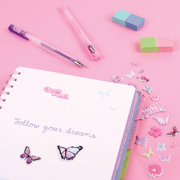 Time to start some serious journaling! Say it with kindness in this great journaling and planner set. This fantastic set starts with a wire bound journal with 5 divided sections for plans, goals, dreams, and more! Also includes stickers, 2 erasers, and 2 gel pens all neatly packaged in a colorful gift box.