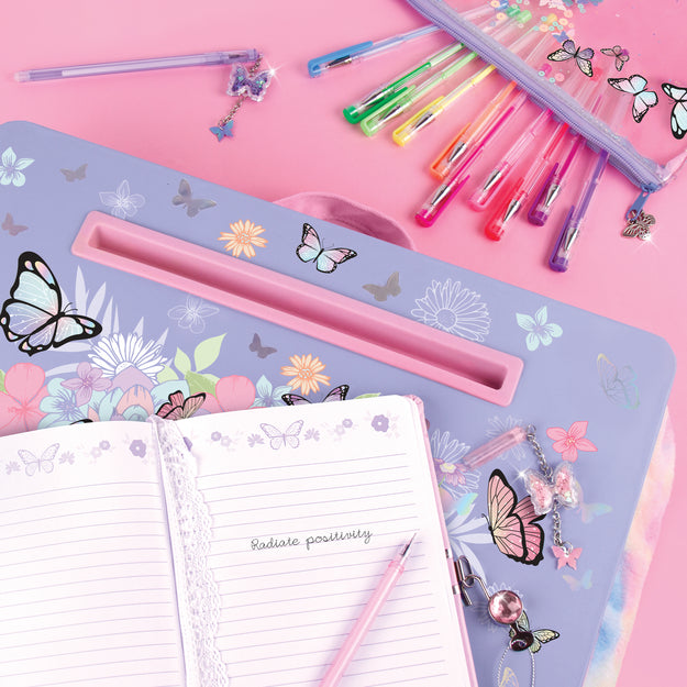 Take your tech to-go with this supercool lap desk. It’s cushiony, comfortable and has a handy slot for your tablet, phone and pens. Make any space your doer's office space with this portable lap desk designed with thoughtful compartments, comfortable cushioning, a sturdy handle, and a totally trendy Butterfly design. A thick, luxurious cushion is ideal for hours of studying or creative fun. It fits perfectly atop little laps and feels comfortable no matter what. PERFECT FOR AGE 6+