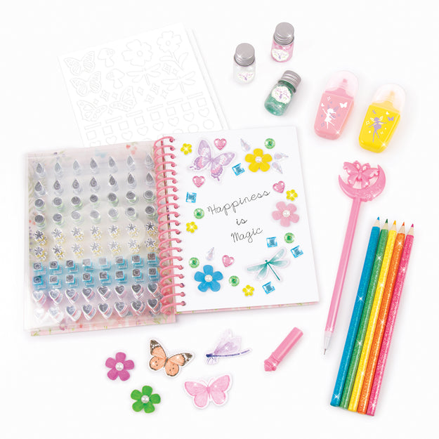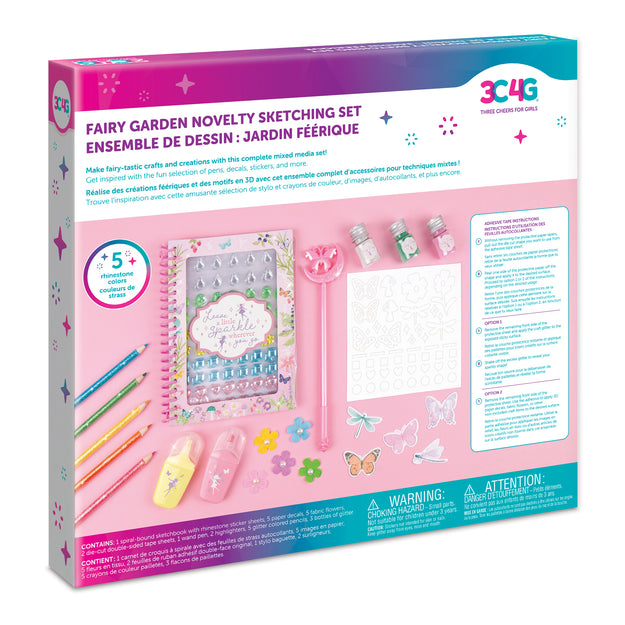 Make fairy-tastic crafts and 3D artworks with this complete sketching media set! Get inspired with the fun selection of creative materials. Tweens will have a fairy blast getting creative with the included spiral-bound sketchbook, gem sticker sheets, paper decals, fabric flowers, die-cut double-sided tape sheets, wand pen, highlighters, glitter colored pencils, and bottles of glitter. 5 gem colors included! Simple instructions guide tweens on how to use the adhesive tape to enhance their creations. The wand pen and fairy dust glitter bottles will make them feel like a real fairy as they sketch, doodle, and write! This is the perfect set to gift creative tweens for any occasion.