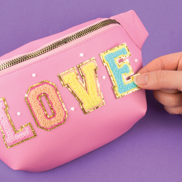 Uber trendy fashion sling bag silhouette with sparkly terry fabric and embroidered patches that spell out LOVE waiting to be added to the handbag for some extra glam. Decorate with gems and head out for fun. Fully lined and patterned. The bag is a lovely pink color with a rainbow strap and heart charm on the zipper. Fully lined and patterned. So chic, practical, and fun to decorate! This makes the perfect gift for stylish tweens, no matter the occasion. A colorful addition to any outfit to complete the look. Perfect for storing cosmetic products, accessories, pencils and pens, and anything else to be taken on the go!
