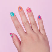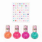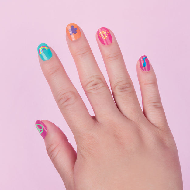 4 Brightly colored bottles of water-based nail polish and totally trendy nail stickers combine for the best street style nail art.