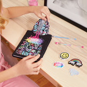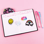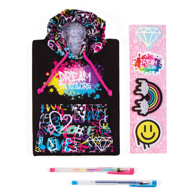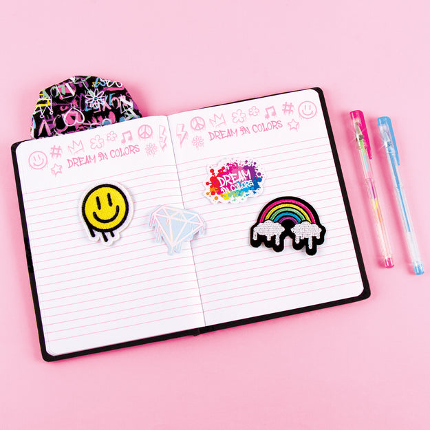 A journal that dresses in style! Street style! This lined journal is wearing its own graffiti, street style hoodie sweatshirt with a hood, drawstrings and front pocket pouch. The funky street style graphic reminds you to dream in color with splashes of artistic icons and lots and lots of color! This 160- page journal is accompanied by 2 gel pens- one with rainbow ink that will transition to a new color over time and a blue sparkly gel pen. If the journal and pens alone weren’t enough to “draw you in” then the vinyl stickers and embroidered might make your day! Smiley face and dripping rainbow embroidered patches and a dripping diamond and dream in color graphic vinyl stickers round out this great set!