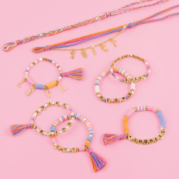 Customize bracelets for your crew! This kit has everything you need to craft your very own Juicy Couture™ jewelry. Create seriously stunning pieces using a mixture of heishi beads, letter beads, charms, thread and elastic cord. They’ll be so pretty, everyone will think they came from a high-end boutique! Ages 8+