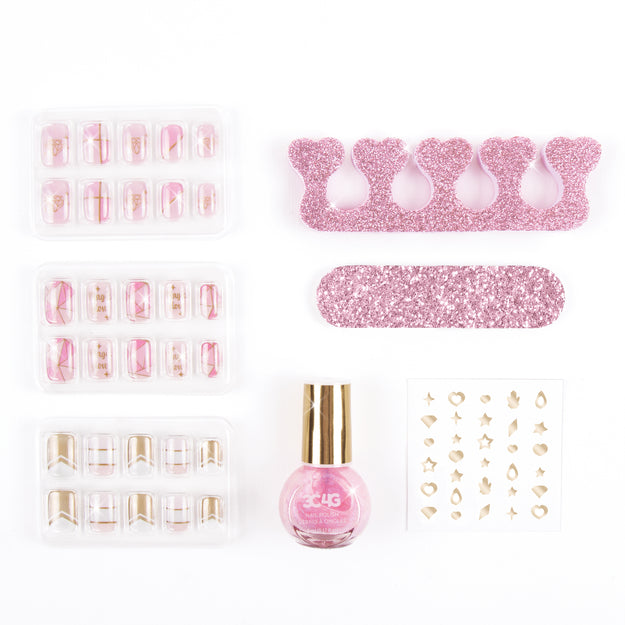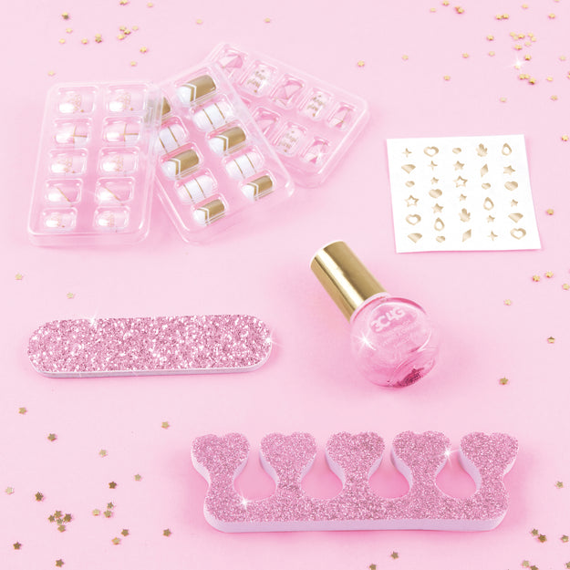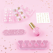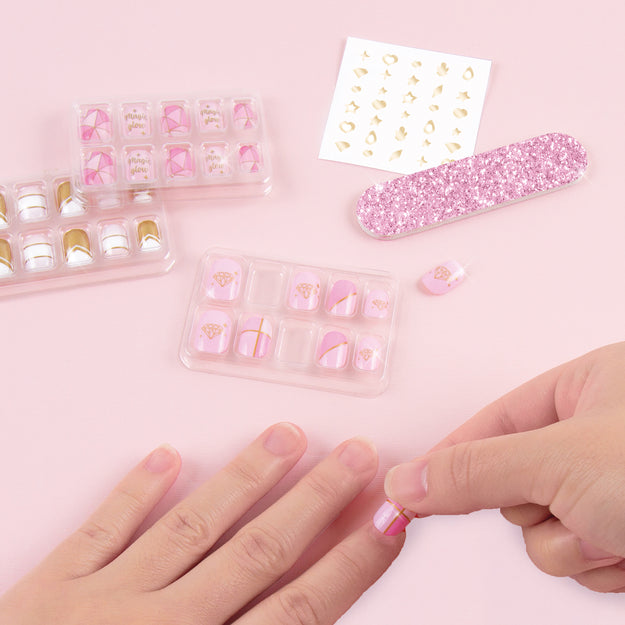 Manicures and pedicures are on today’s schedule. Invite some friends to join in on the fun as the Pink and Gold Boxed Nail Set contains 3 sets of press-on nails along with nail polish and nail stickers. Kids can customize their look by mixing and matching the press-on nail sets with painting their nails and adding stickers. This set features a pink glitter toe separator and nail file. The color palette mixes gold with shades of pink. This kit comes packaged in a reusable golden window box.
