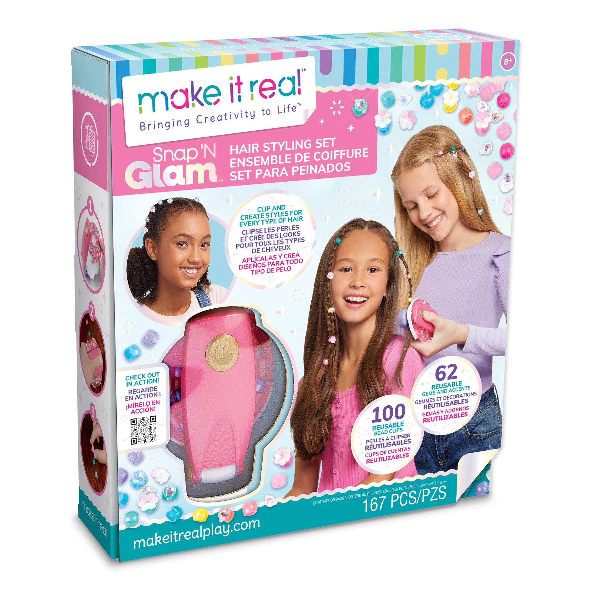 Clip and create styles for every type of hair! Using the included 100 bead clips with butterfly, gem, and flower accents, young fashionistas can create looks that express their unique styles in three simple steps: Load, clip, style! Load the cartridge with the desired bead clips, then clip onto hair with ease. All bead clips and accents are easy to remove and reusable. Includes a measuring tool to make ensure easy application. Use as accents or connect locks of hair together for more elaborate styles, the possibilities are endless! This makes a great gift idea for stylish tweens, for any occasion!