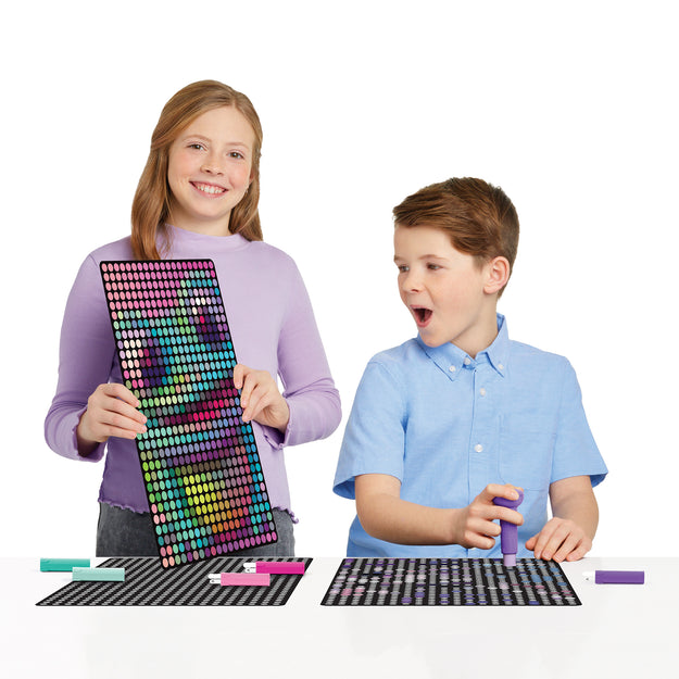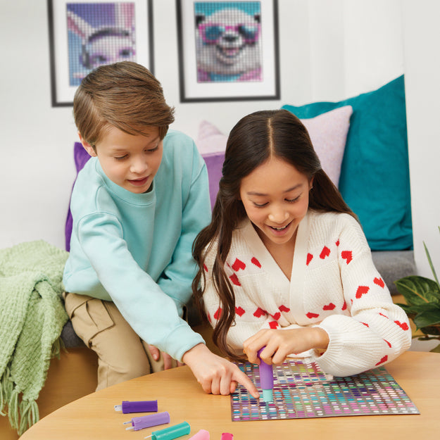 Enjoy the satisfying delight of creating your own dot art posters! Check the stamper for the number on the paper dot, then find the matching number on the poster. Align the circles and stamp! Continue to reveal three colorful dot art posters to hang up and enjoy. Each set contains everything needed to reveal three artworks featuring a DJ bunny, fun frog, and chillin’ panda, including a stamper, dot cartridges, and 1800 dots. Experience more satisfaction with every stamp and admire the rewarding result. Stamp To Reveal™ Satisfying Dot Art makes a great gift for trendy tweens, whether for a birthday, holiday, or just because.