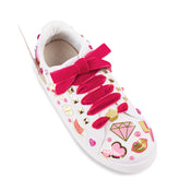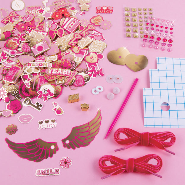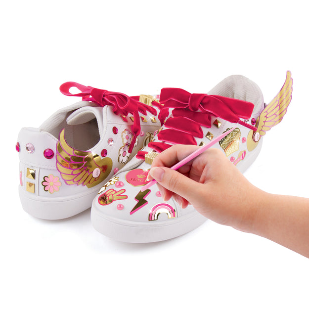 It's temporary tattoos for your shoes. Do and redo. Add flair to your footwear with decorative adhesive stickers. Add a little or add a lot. Transform your shoes again and again. Bling out your shoes to make them exceptionally chic! Includes bead charms, velvet shoelaces and gold metallic wings. (Adhesive peels away- remove any excess with warm water) Not recommended for some shoe fabrications. Ask a parent or guardian’s permission before decorating shoes. Ages 8+