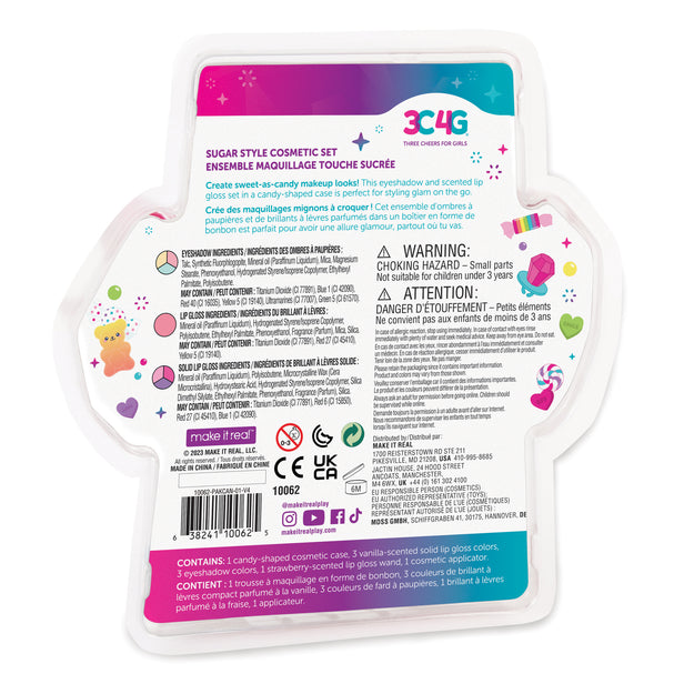 Take this sweet set on the go! Complete with a colorful selection of eyeshadow and scented lip gloss stored in a cute candy-shaped case, this set is sure to sweeten any fashionista’s day. Includes 3 vanilla-scented solid lip gloss colors, 3 eyeshadow colors, and 1 strawberry-scented lip gloss wand. The included cosmetic applicator makes styling easy! All cosmetics are safety tested for kids ages 8+. Mix and match colors to try out different looks and explore new glam! Perfect for tweens looking to express their unique style. A great gift idea for stylish tweens for birthdays, holidays, or any occasion!