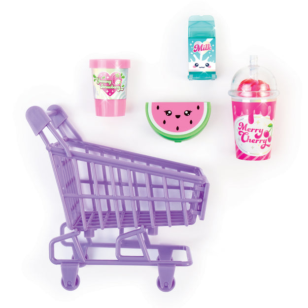 Take a stroll down the glam aisle and find a sweet selection of scented lip gloss. Enjoy watermelon, cherry, strawberry, and vanilla-scented lip gloss in adorable snack-shaped pots. The included uber trendy miniature shopping cart/trolley really rolls! Add sweet flair to any makeup look with the stunning lip gloss colors. Take on the go for easy styling and restyling at play dates and slumber parties. Perfect for tweens getting started with makeup and exploring their unique style. Great as a gift for an occasion, this set is sure to please any young fashionista. All cosmetics are safety tested for kids ages 8+.