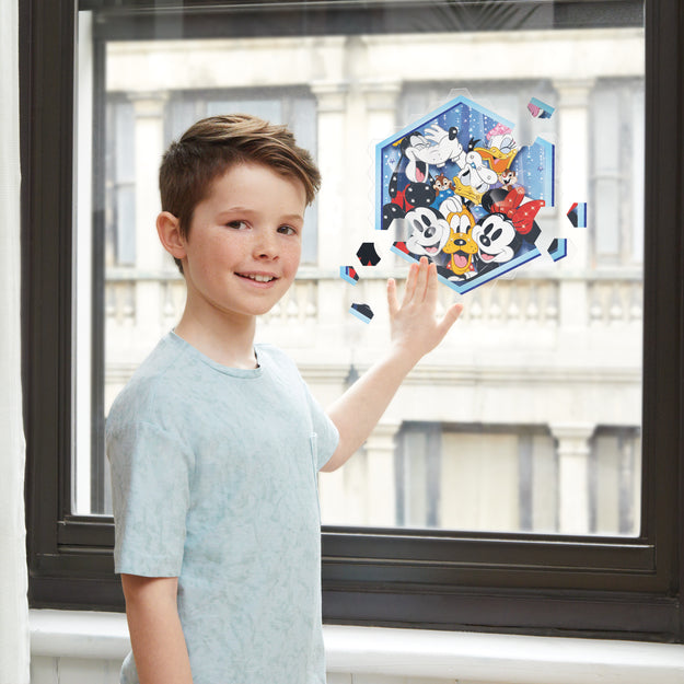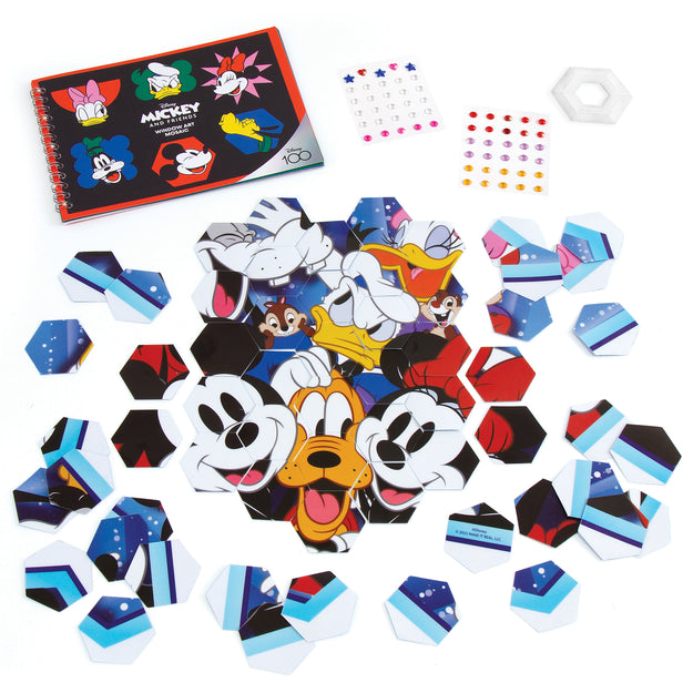 The fun of a puzzle and the result of a beautiful window decal! Start in the center of the puzzle, then challenge yourself to align the hexagons to create a fun Disney Mickey and Friends mosaic! Each kit contains: precut vinyl cling pieces on printed paper backing, hexagon removal tool to make easy transitions when moving the location of a piece or pieces, a story book with pages to store the window clings, and simple instructions. When finished, admire as the sunshine illuminates the window art mosaic and brings a pop of color to the space. The window clings can also be place on windows mirrors, flat surface shower doors, and more!