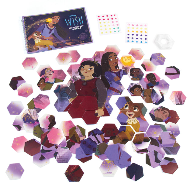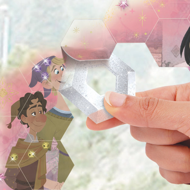 The fun of a puzzle and the result of a beautiful window decal! Start in the center of the puzzle, then challenge yourself to align the hexagons to create a fun Disney Wish mosaic! Each kit contains: precut vinyl cling pieces on printed paper backing, hexagon removal tool to make easy transitions when moving the location of a piece or pieces, a story book with pages to store the window clings, and simple instructions. When finished, admire as the sunshine illuminates the window art mosaic and brings a pop of color to the space. The window clings can also be place on windows mirrors, flat surface shower doors, and more!